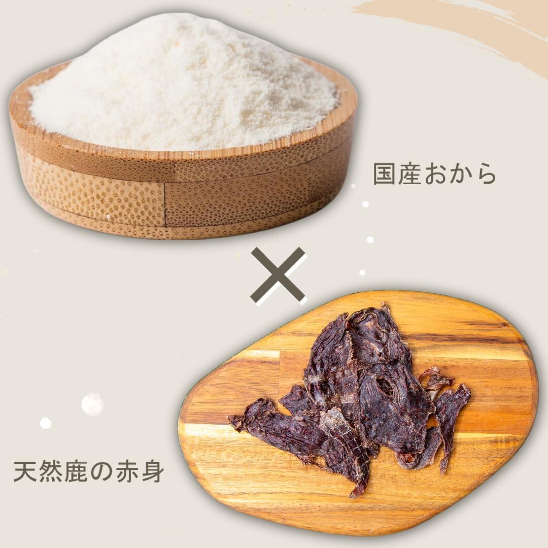 新鮮な天然鹿の赤身は、低脂肪で高タンパク質。栄養たっぷりで満足感もあります。そして、おからクッキーは、おからのヘルシーな成分と鹿肉の旨味が絶妙にマッチした美味しいおやつです。